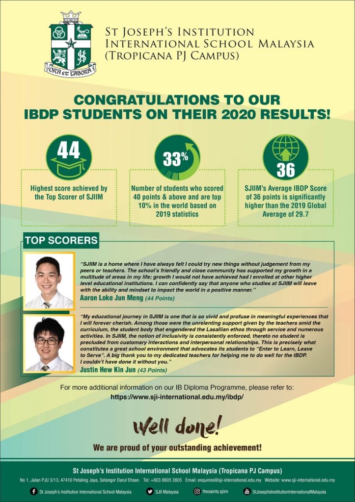 For the third year running, students of St. Joseph’s Institution International School Malaysia (SJIIM) once again produced outstanding results in the recent 2020 International Baccalaureate Diploma Programme (IBDP) examinations. 33% of its IBDP students obtained 40 points and above which should place them in the top 10% of results worldwide. SJIIM also achieved an overall average score of 36 points, far above the 2019 IBDP Global Average of 29.7 points. These result statistics are especially good considering that the students have completed their IBDP studies in challenging and unnatural circumstances given the COVID-19 pandemic gripping the world this year.