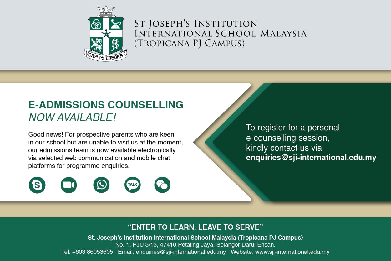 Good news! For prospective parents who are keen in our school but are unable to visit us personally at SJIIM at the moment, our admissions team is now available electronically via selected web communication and mobile chat platforms for programme enquiries. To register for a personal e-counselling session, kindly contact us via enquiries@sji-international.