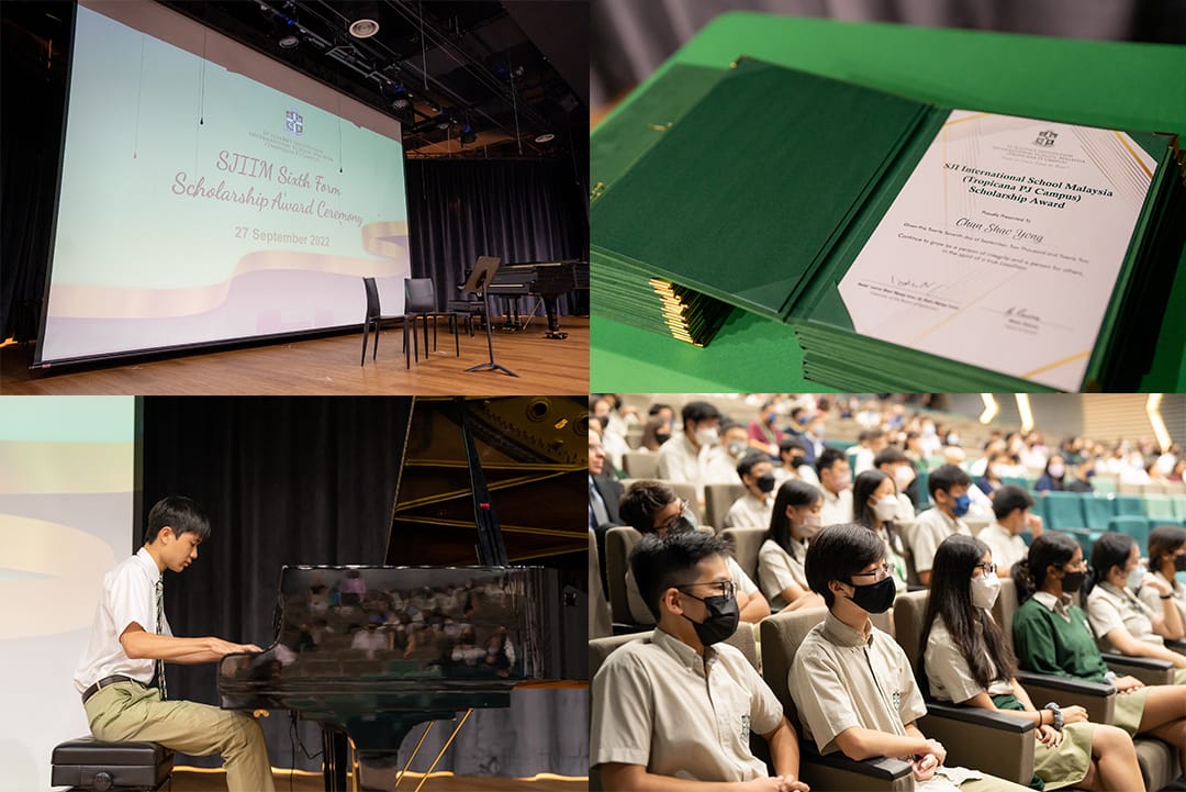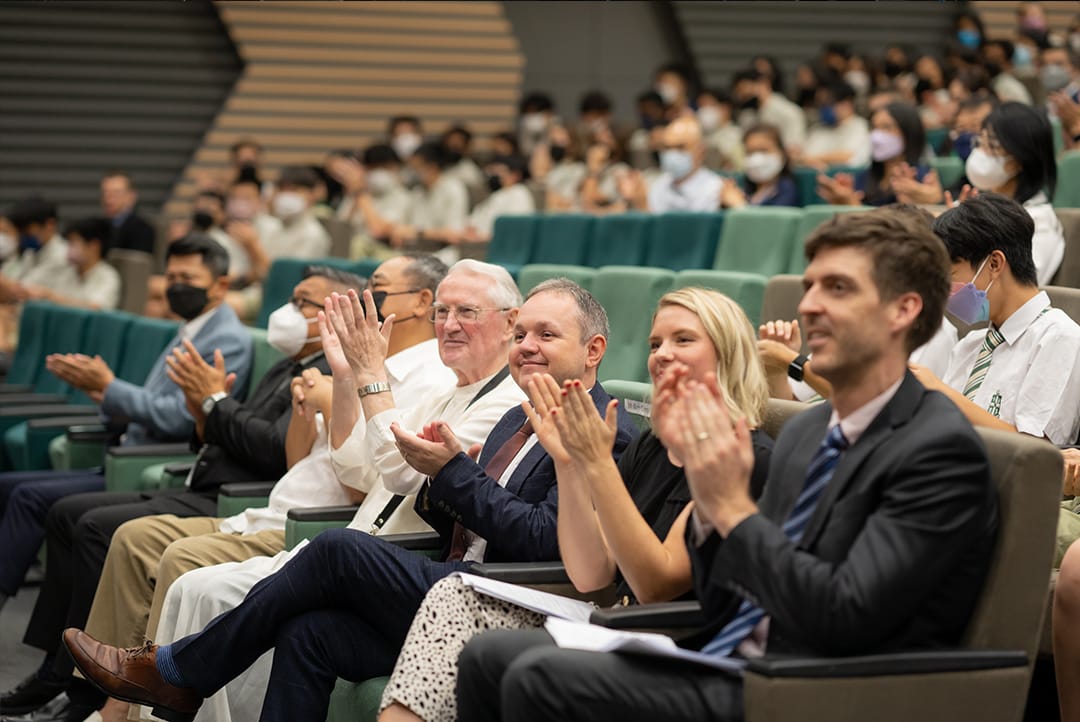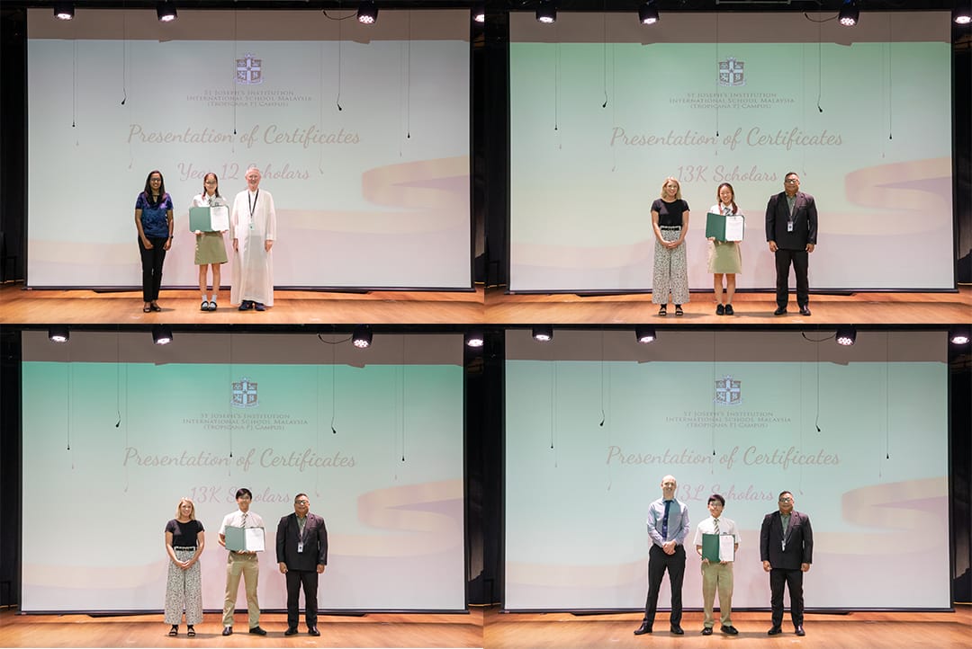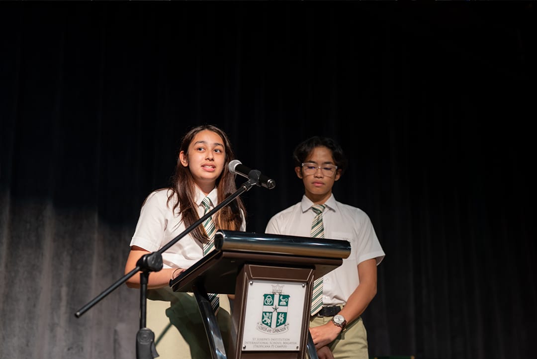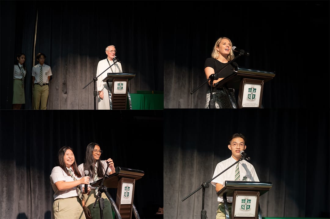 Mia Chellam and Adley Danial were the emcees for the ceremony. We heard speeches from our Lasallian Youth Movement leaders, Meagan Motha and Allison Yee, who reflected on the importance of service in building community, from Alastair Tan, President of the SRC, who shared the ways in which the scholarship has afforded him opportunities to grow as a student, leader, and cohort member. Ms. Sarah Cole, Head of Sixth Form, gave a speech highlighting the purpose of our scholarship programme and the ways that these students have enriched our community beyond their academic achievements. There were musical performances by Shao Yong Chan, Caithleen Eng, Deborah Ong, and Dhanya Dharmendran and a special performance led by Jynez Tan.