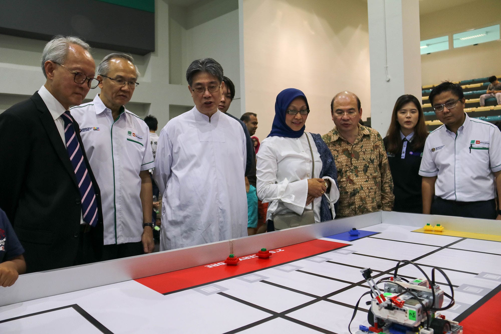 MOE Private Education Division Director , Datin Sri Hajah Nor Zamani binti Abdol Hamid (fourth from left) checking out the winning team’s robot in action